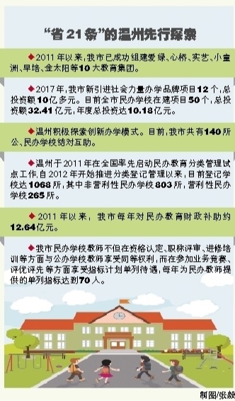 上周五,我市教育部门组织召开相关政策法规学习会,重点详解“省21条”,并就规范今年民办中小学招生工作提出了具体要求,强调要与当地同类公办学校同期面向社会自主招生。据悉,“省21条”扶持与规范并重,其中涉及促进民办教育发展的政策条文共有11条,而且不少来自于“温州经验”,比如建立分类管理制度、拓展办学模式、拓宽融资渠道等方面,已在温州先行探索。